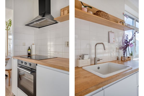 De strakke keuken is uitgevoerd in een lichte kleurstelling en voorzien van diverse inbouwapparatuur, waaronder een kookplaat, oven, afzuigkap en koelkast. Vanuit de keuken is er directe toegang tot de achtertuin.