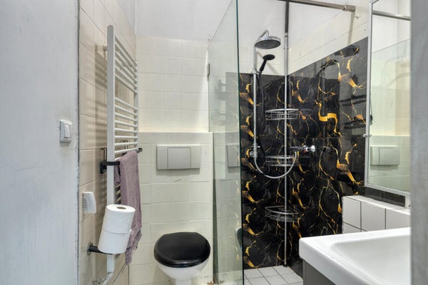 Op de 1e etage bevind zich een ruime slaapkamer met voldoende (inbouw)kastruimte, douche, wastafel en tweede toilet, tweede slaapkamer of ideale werkkamer, grenzend aan een zeer ruim dakterras (6m bij 5 m).