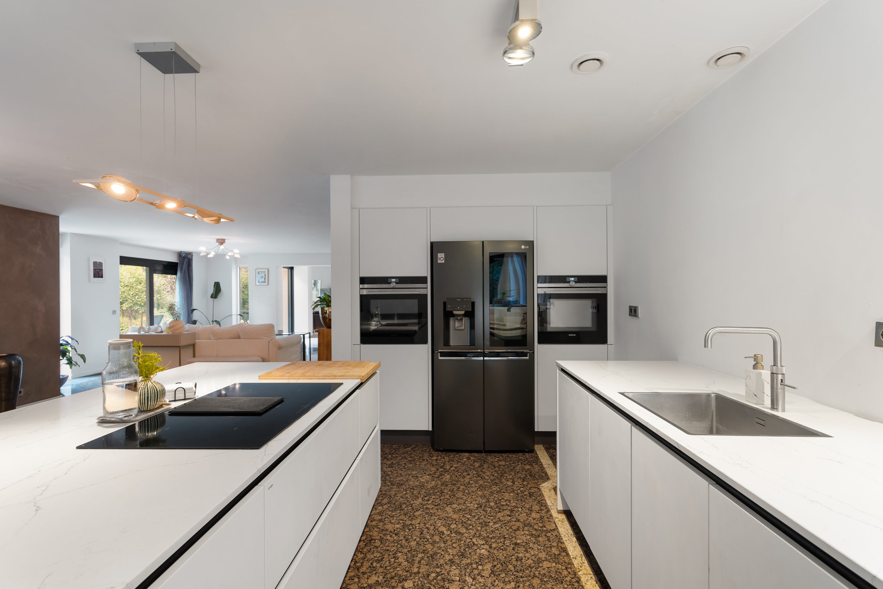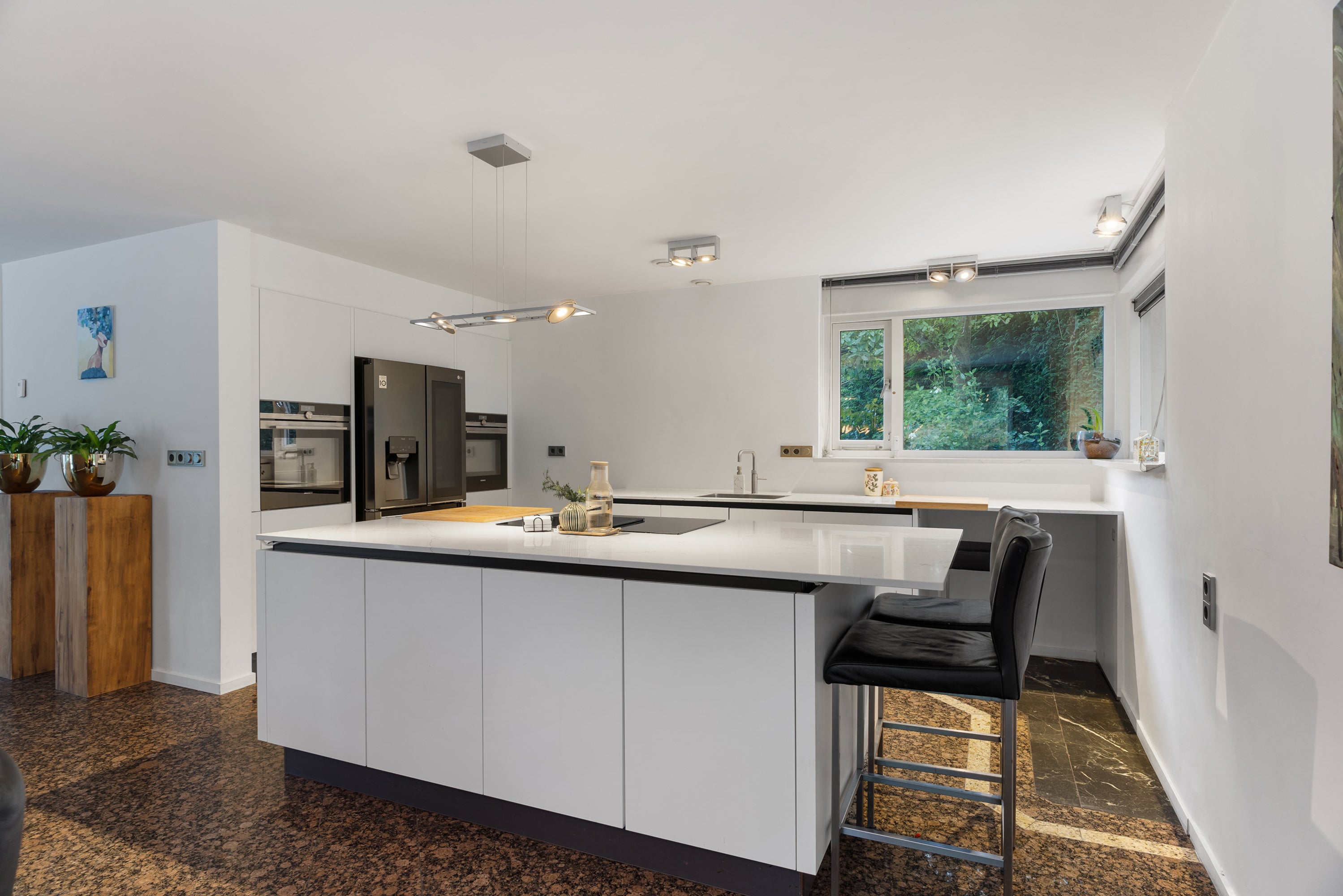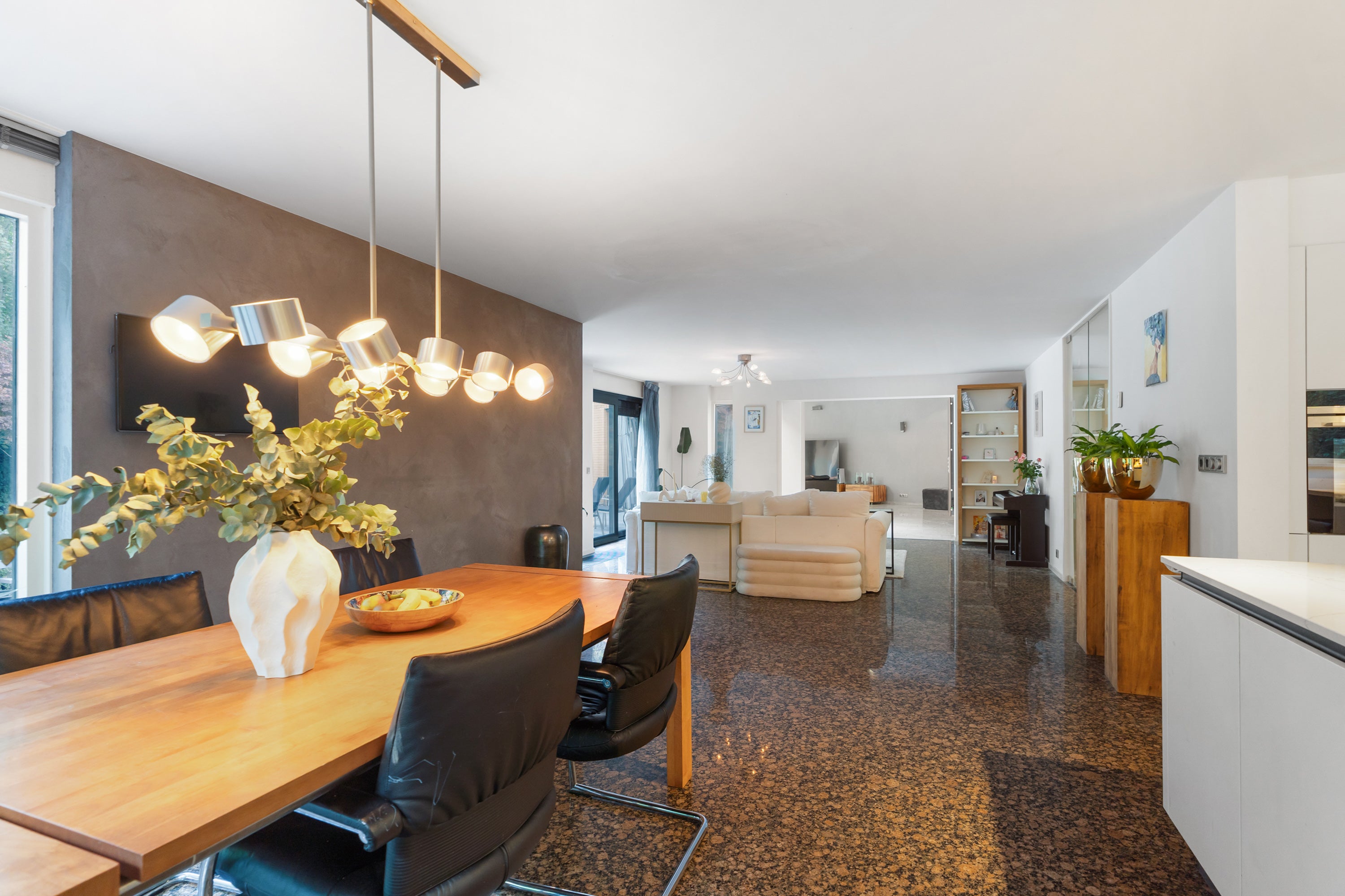 De begane grond herbergt een royale ontvangsthal, een ruime L-vormige woonkeuken met moderne inbouwapparatuur en een gezellige woonkamer met een luxe open haard. Op de eerste verdieping zijn twee slaapkamers, een luxe badkamer met stoomcabine en een master bedroom met inbouwkasten. Bovendien zijn er zonnepanelen op het dak voor energie-efficiëntie.