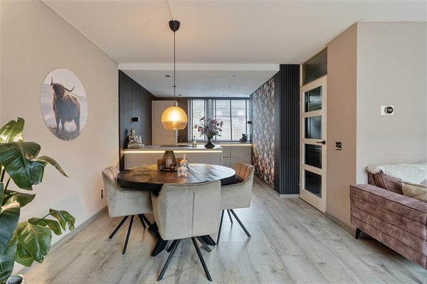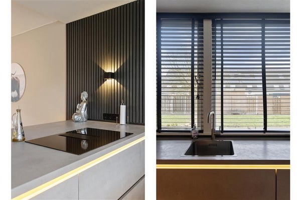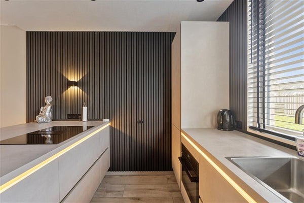 De open keuken vormt het hart van het huis; hier wordt samen gekookt, gelachen en geleefd. Het stijlvolle schiereiland biedt een praktische werkruimte én een gezellige plek waar je met een kop koffie de dag kunt bespreken. Het hoogwaardige aanrechtblad, de moderne inbouwapparatuur (zoals een oven, vaatwasser en inductiekookplaat), en de stijlvolle uitstraling maken dit een echte eyecatcher.