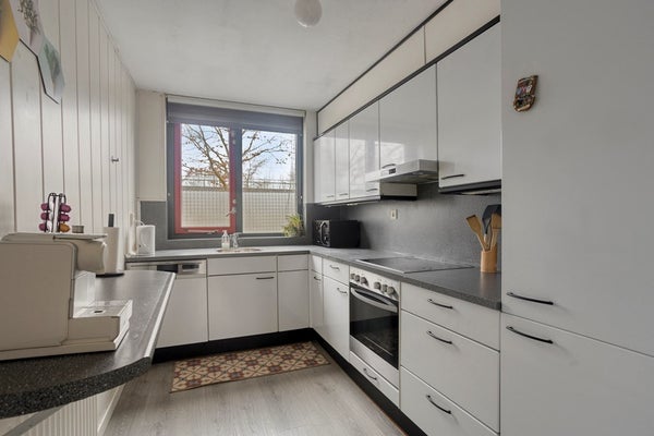De keuken, gelegen aan de voorzijde, is praktisch ingericht en voorzien van diverse inbouwapparatuur, waaronder een oven, kookplaat, afzuigkap, vaatwasser en koelkast.