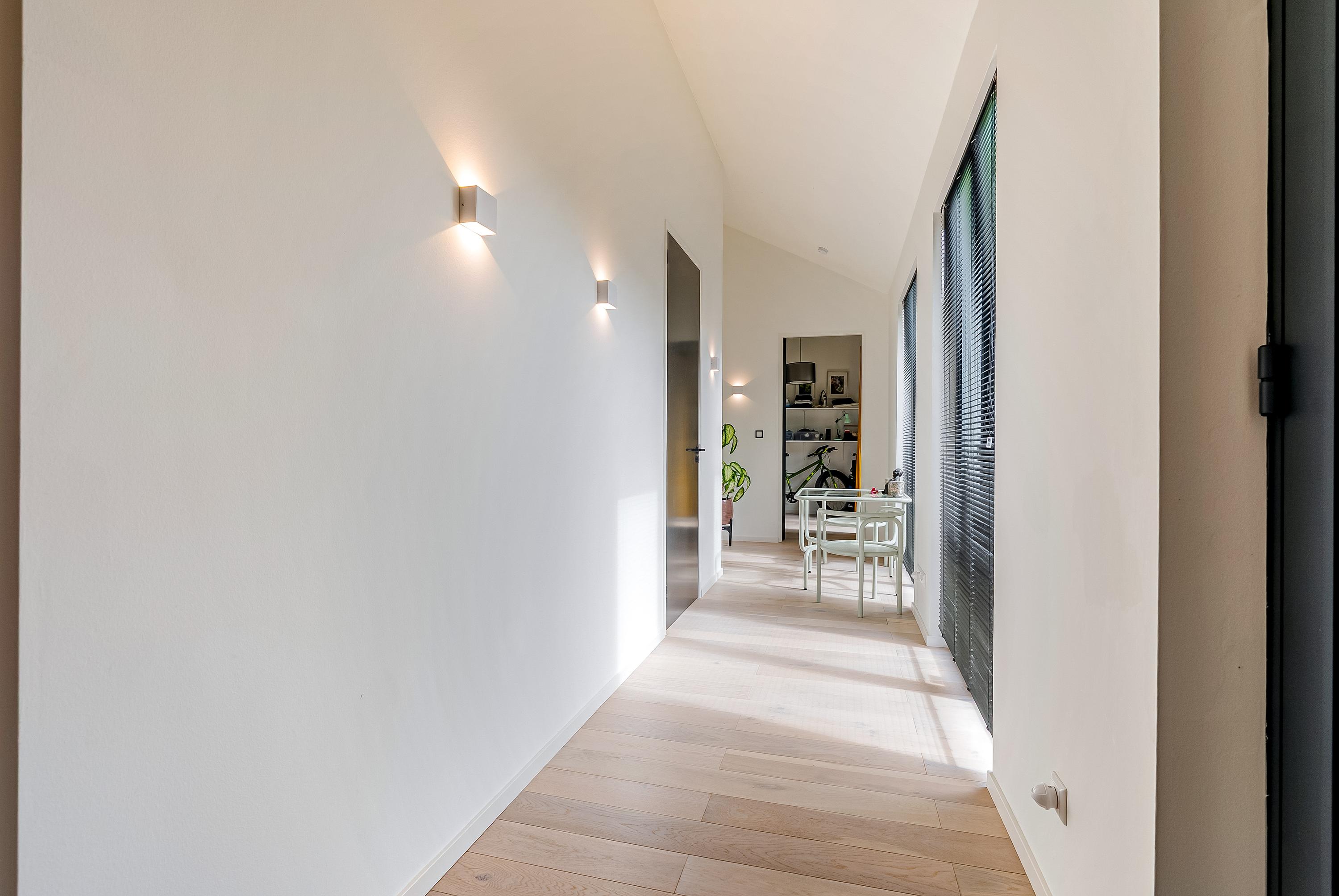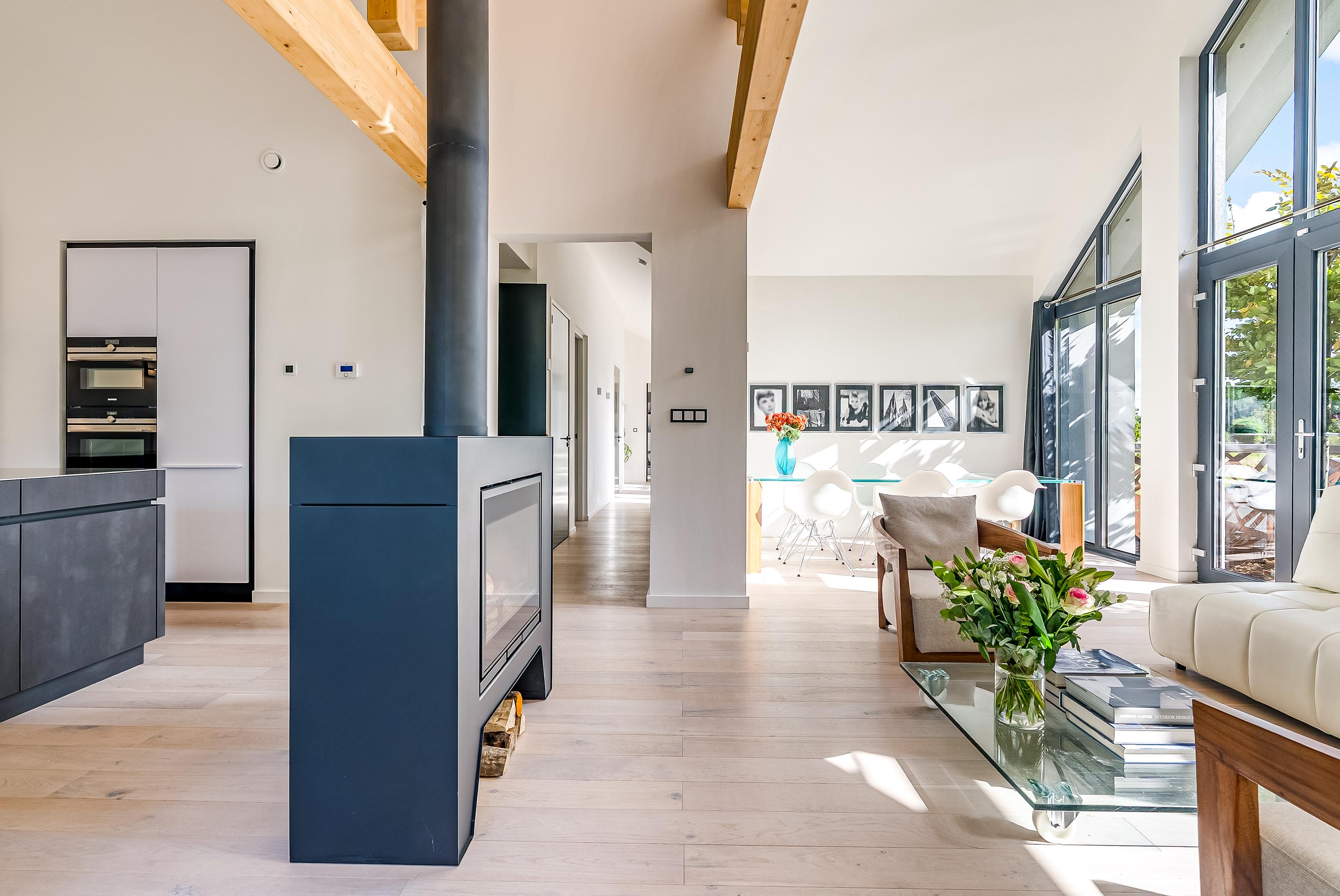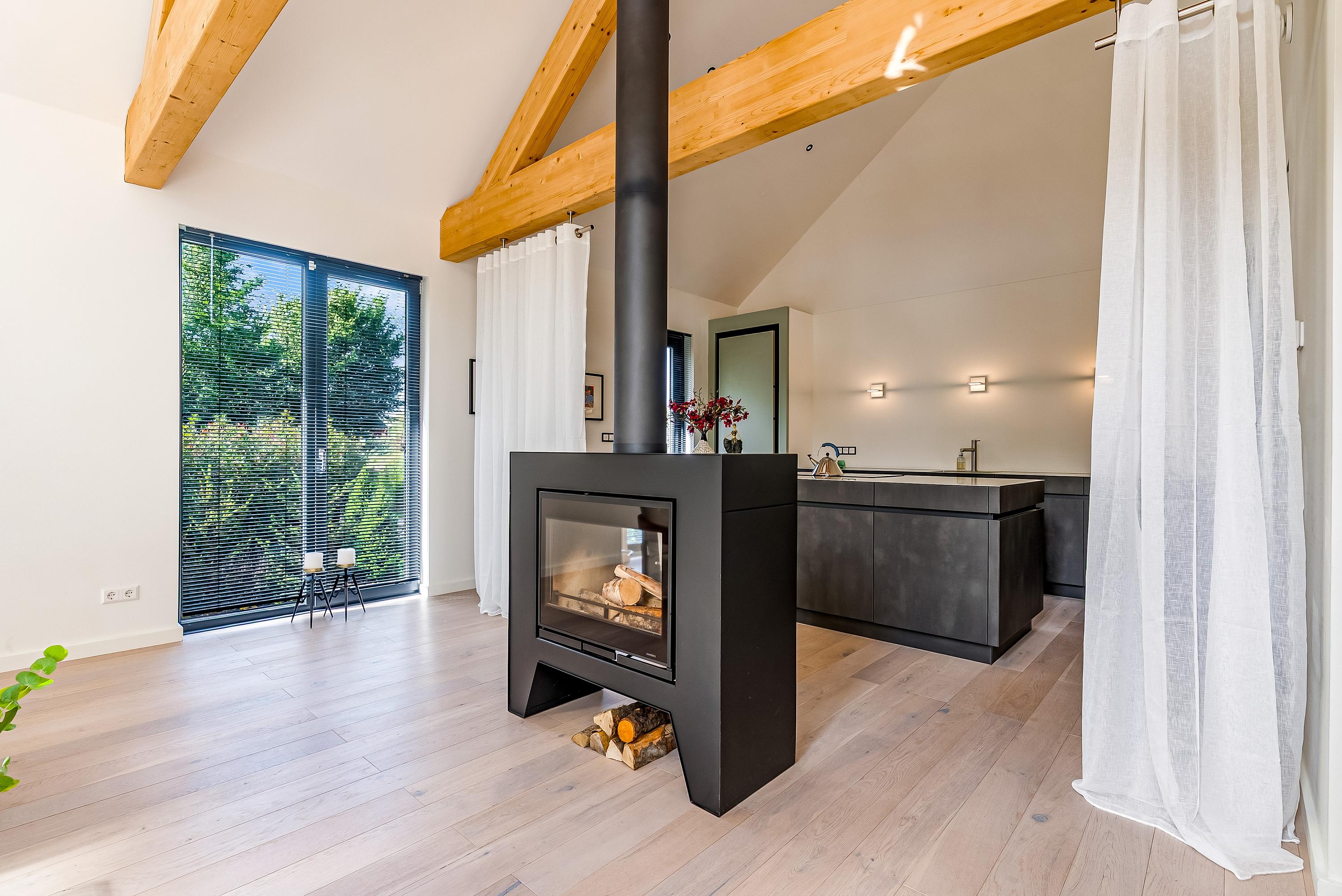 Let op: bieden vanaf € 850.000,-- k.k. Deze moderne, vrijstaande woning in Almere Oosterwold, ontworpen door architect Oebele Hoekstra, biedt fraaie architectuur en een speelse indeling. Bij binnenkomst komt u in de ruime hal die leidt naar een royale woonkamer met hoge nok, houten balken en grote ramen. De tweezijdige houtkachel zorgt voor extra sfeer.