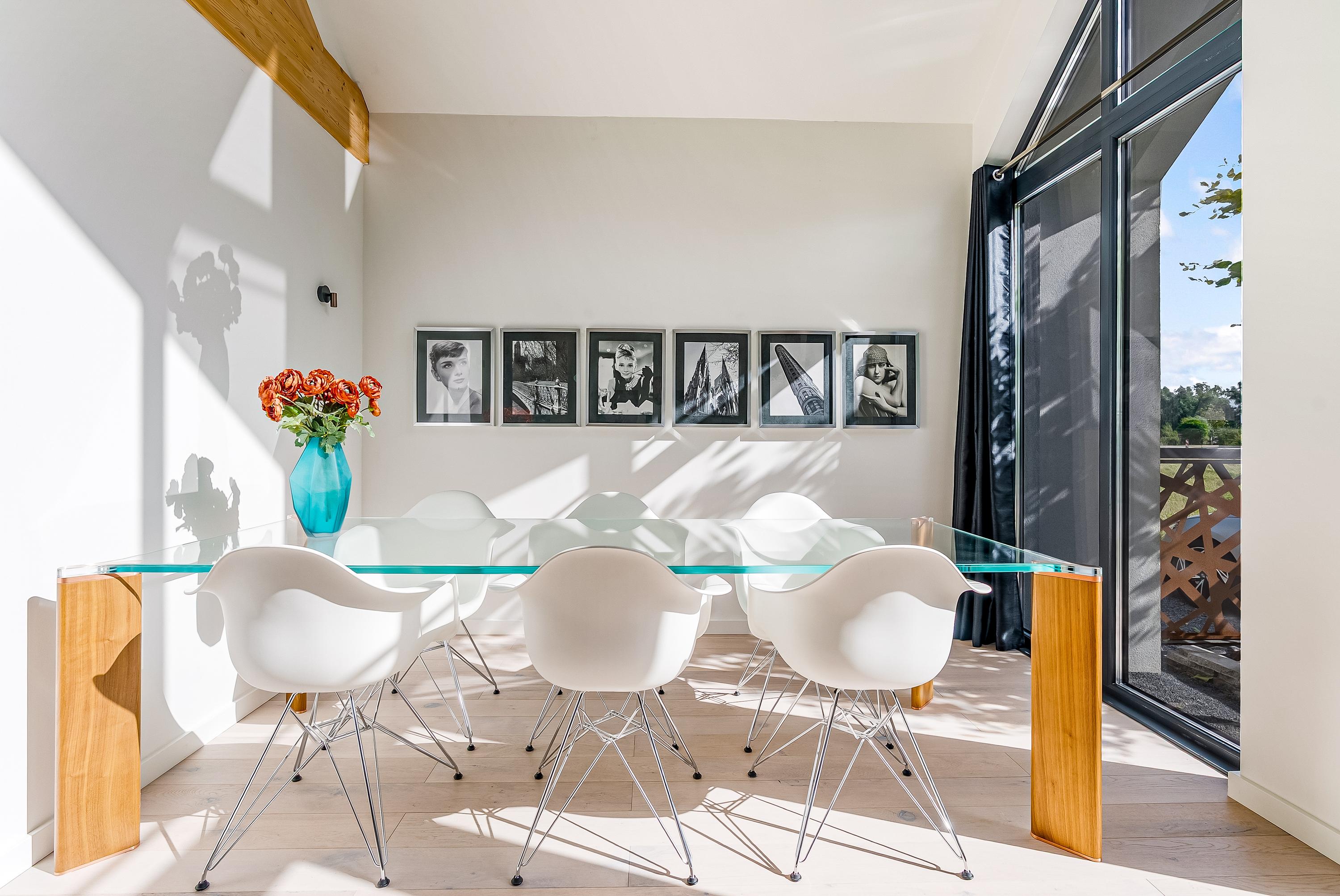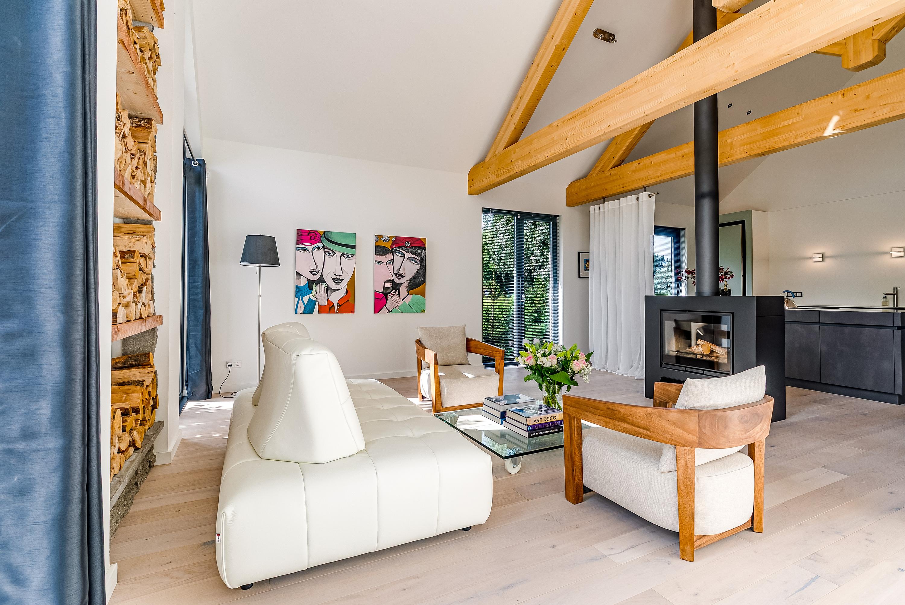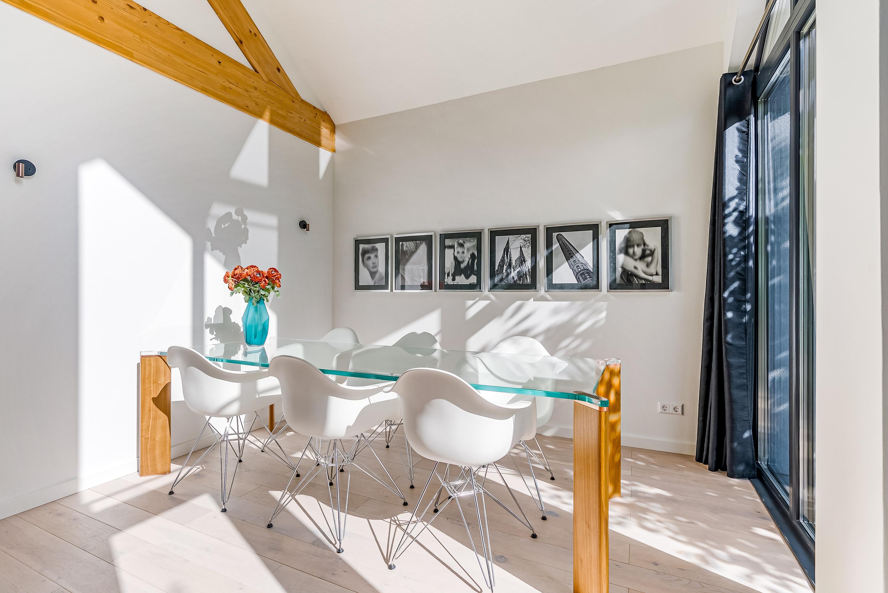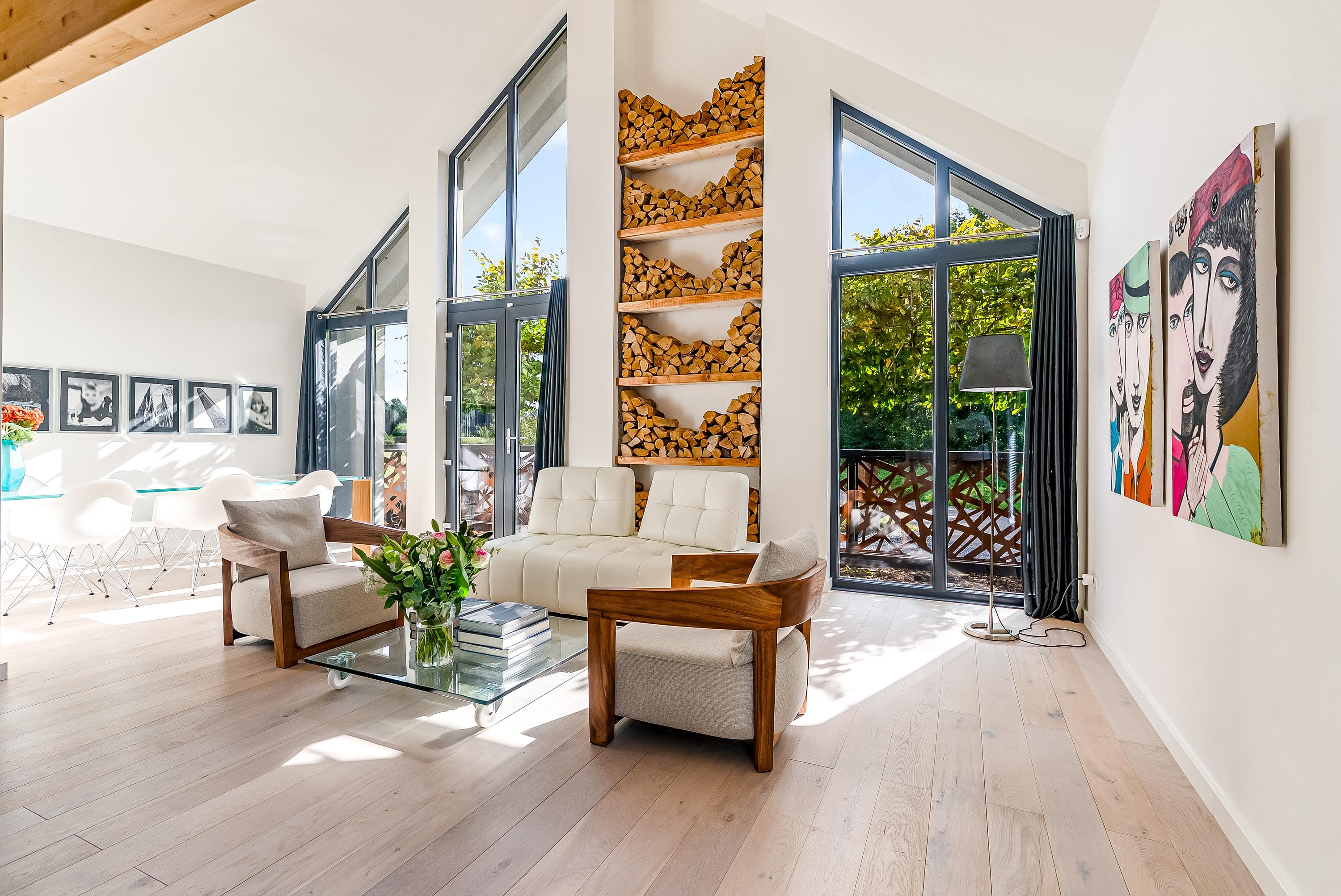 Let op: bieden vanaf € 850.000,-- k.k. Deze moderne, vrijstaande woning in Almere Oosterwold, ontworpen door architect Oebele Hoekstra, biedt fraaie architectuur en een speelse indeling. Bij binnenkomst komt u in de ruime hal die leidt naar een royale woonkamer met hoge nok, houten balken en grote ramen. De tweezijdige houtkachel zorgt voor extra sfeer.