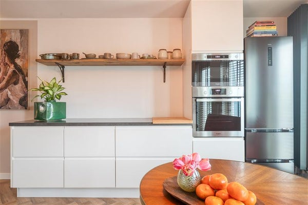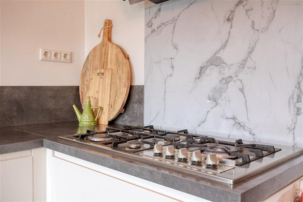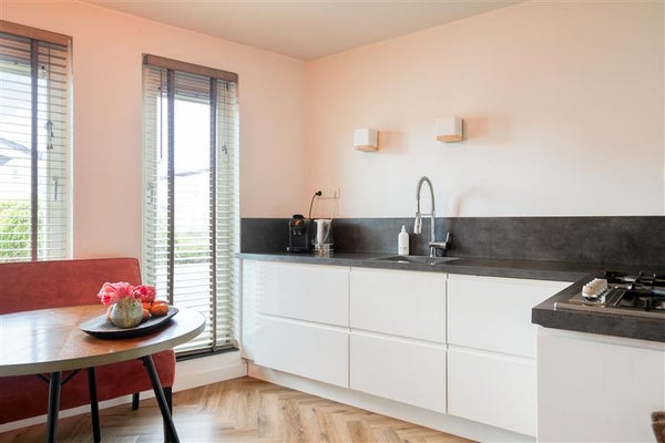 Via de woonkamer loop je zo door naar het eetgedeelte en de keuken. De half open keuken trekt meteen de aandacht, niet alleen door de slimme opzet, maar ook door het strakke design. Moderne inbouwapparaten zoals een vaatwasser, oven, gaskookplaat, magnetron en koelkast maken koken een feestje. Of je nu een culinair zeven-gangenmenu klaarmaakt of snel een kop koffie zet, deze keuken is jouw partner in crime.
