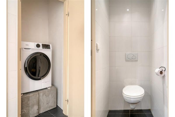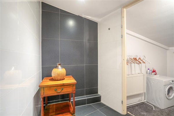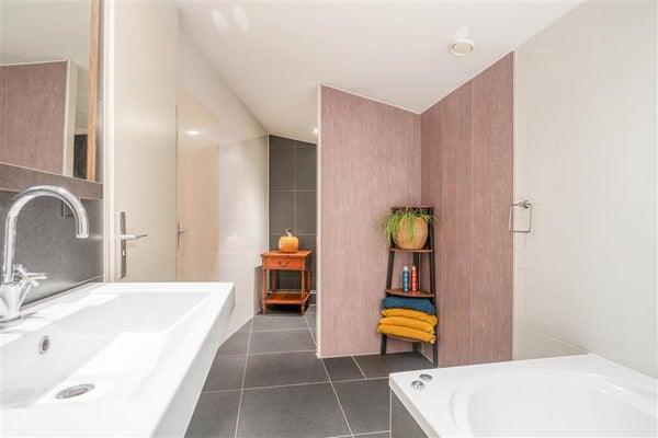 De badkamer combineert praktische functionaliteit met een stijlvolle uitstraling. Uitgerust met een heerlijk ligbad, een moderne wastafel en met toegang tot een separaat toilet, biedt deze badkamer ultiem comfort en hygiëne. Vanuit deze ruimte heb je bovendien toegang tot de aangrenzende was- en multifunctionele ruimte, perfect om spullen op te bergen of om te toveren tot een gezellige hobbykamer.