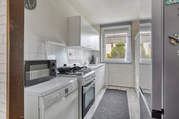 De keuken is aan de voorzijde van de woning gesitueerd. Hier vind je een langwerpig aanrechtblad met spoelbak en diverse losstaande apparatuur, waaronder een kookstel, vaatwasser en koelkast. De keuken kan desgewenst naar eigen wens worden gemoderniseerd, waardoor je hier je eigen culinaire droomruimte kunt creëren.