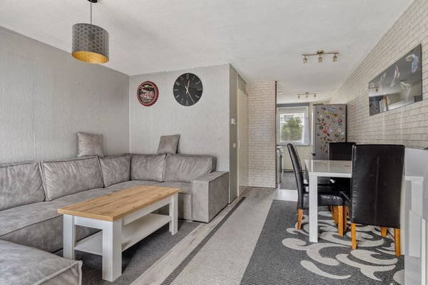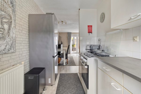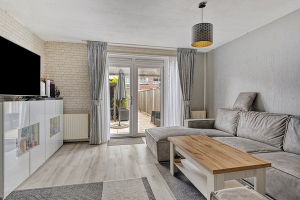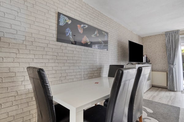 De woonkamer vormt het hart van deze woning. Dankzij de open indeling en de grote raampartijen geniet je hier van veel licht en ruimte. De openslaande deur naar de tuin zorgt voor een fijne verbinding tussen binnen en buiten. Deze woonkamer leent zich uitstekend voor zowel een comfortabele zithoek als een sfeervolle eethoek, waardoor je gasten met plezier kunt ontvangen of gewoon heerlijk kunt ontspannen.