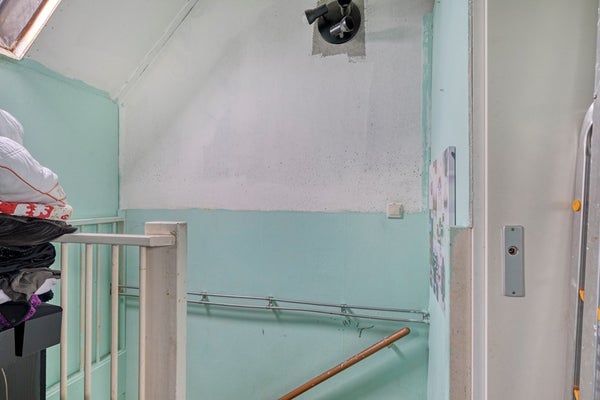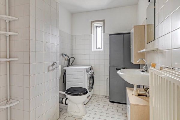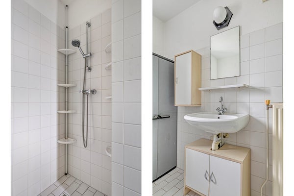 De badkamer grenst aan de overloop en is volledig betegeld. Je vindt hier een open douche, een staand toilet en een wastafel met opbergmeubel. Hoewel de badkamer netjes is onderhouden, kun je er ook voor kiezen om deze naar moderne maatstaven te vernieuwen.