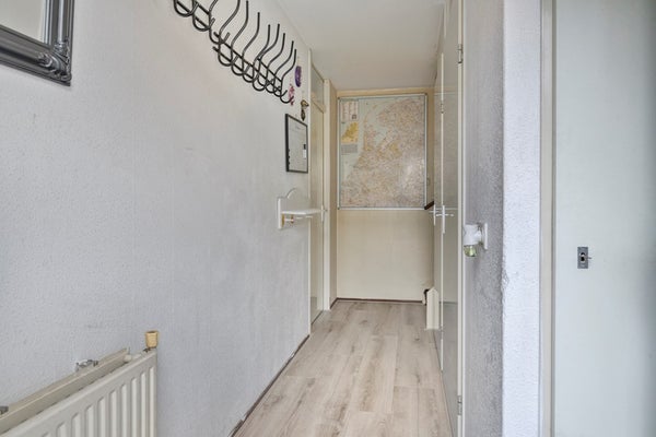 De entree bereik je via de voortuin en oprit, waar je bovendien de beschikking hebt over parkeerplek voor 2 auto’s. Eenmaal binnen kom je in de hal, die toegang biedt tot de woonkamer, de trapopgang naar de eerste verdieping en meerdere kastruimtes. Hier is voldoende plek voor een kapstok of opbergmeubel, waar je allerlei spullen netjes kunt opbergen en de woning altijd een verzorgde indruk maakt.