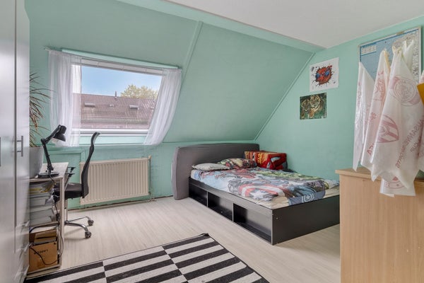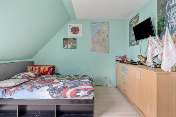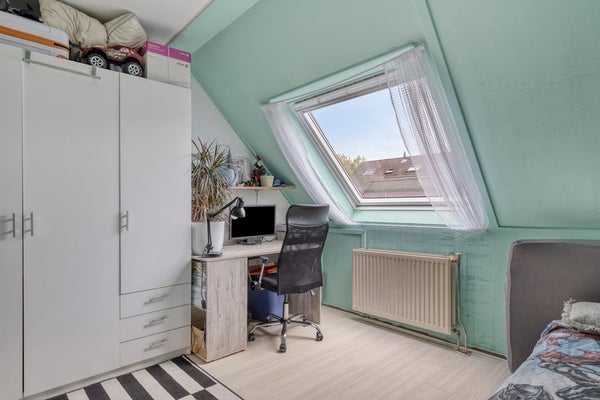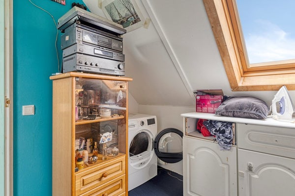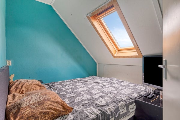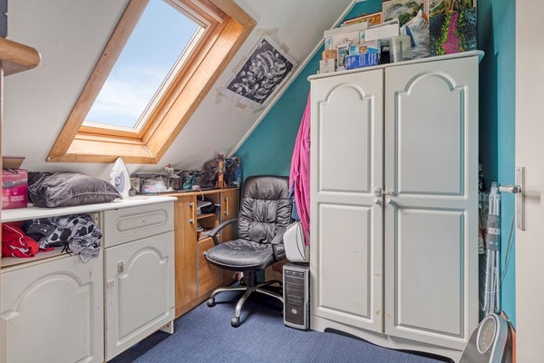 Een vaste trap leidt je verder omhoog naar de tweede verdieping, waar zich nog twee extra slaapkamers en een handige kastruimte bevinden. Deze verdieping maakt de woning extra geschikt voor grotere gezinnen of voor wie behoefte heeft aan meerdere werk- of hobbyruimtes. De twee slaapkamers in de punt van het dak bieden voldoende ruimte voor een bed of bureau. De kamers zijn multi-inzetbaar en kan eenvoudig worden aangepast aan je persoonlijke woonwensen.
