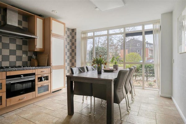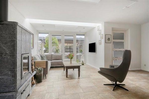 De woonkamer is licht en ruim, met grote ramen die voor veel natuurlijk daglicht zorgen. Hier heb je genoeg ruimte om een comfortabele zithoek en een eettafel te plaatsen. Het is een fijne centrale plek in huis waar iedereen altijd samenkomt. De open keuken sluit hierop aan en is voorzien van alles wat je nodig hebt. De opstelling is praktisch en biedt genoeg werkruimte, wat koken makkelijk en plezierig maakt.
