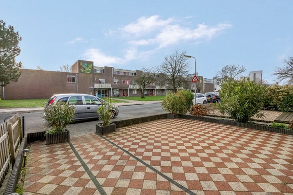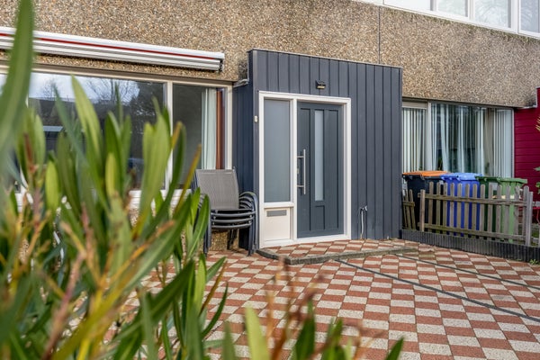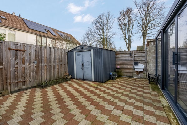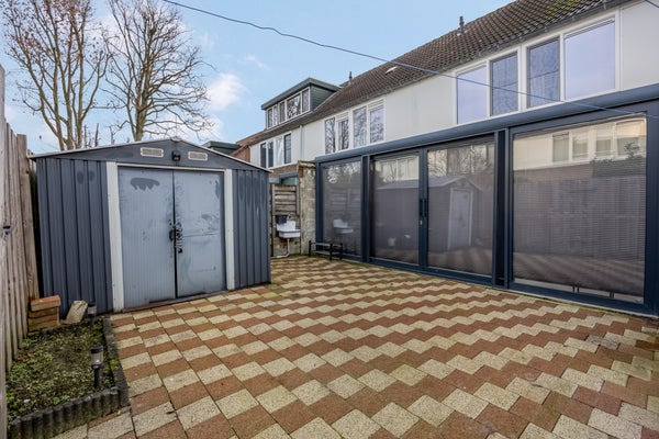 De royale serre staat via twee schuifdeuren in directe verbinding met de achtertuin, die grotendeels is bestraat en daardoor onderhoudsvriendelijk is. Achterin bevindt zich een poort naar de steeg en voor de fietsen is er een praktische berging. De voortuin is afgewerkt met dezelfde nette betegeling als achter, waardoor het geheel een verzorgde uitstraling heeft.