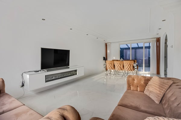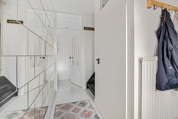 Je kunt deze woning herkennen aan het verzorgde uiterlijk als je vanaf de straat richting de voordeur komt gelopen. Hier vind je de trapopgang en de toiletruimte met wit sanitair en stijlvol tegelwerk. De lichte woonkamer is uitgevoerd met een strakke en nette vloer, strak stucwerk, plafondlijsten en inbouwverlichting. Het zitgedeelte bevindt zich aan de voorzijde en aan de achterzijde vind je het royale eetgedeelte, vlak naast de keuken. Door de grote ramen valt veel licht naar binnen en achter een van de deuren is een handige trapkast. Een brede doorgang met boog verbindt de woonkamer met de keuken waar een lichte hoekopstelling met hoge bovenkasten staat. Ook hier is weer gebruik gemaakt van rustige kleuren en alle benodigde apparatuur is ingebouwd: een inductie kookplaat, afzuigkap, oven, vaatwasser, koelkast en een vriezer. De circa 24 m2 grote serre is het perfecte verlengstuk van de woning. Je kunt deze ruimte bereiken vanuit de keuken en twee grote schuifdeuren zorgen voor een optimale verbinding met de tuin.