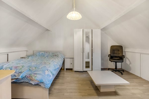 Via de vaste trap bereik je de tweede verdieping waar twee grote ruimtes op je wachten, één heel geschikt voor gebruik als royale slaapkamer. De hoge nok zorgt voor een goede stahoogte en in de schuinten van het dak is veel bergruimte.