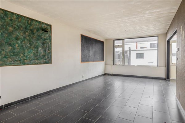 De woonkamer is een lichte doorzonwoonkamer met grote raampartijen en een tegelvloer.