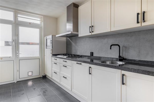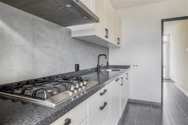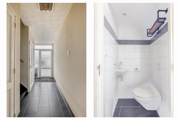 Ruime entree met meterkast, toiletruimte met wandcloset en fonteintje en de trapopgang naar de eerste verdieping. Vanuit de hal bereik je de keuken, die is uitgerust met een vaatwasser, koelkast, oven, gaskookplaat en een afzuigkap. Vanuit de keuken is er toegang tot de onderhoudsarme achtertuin.