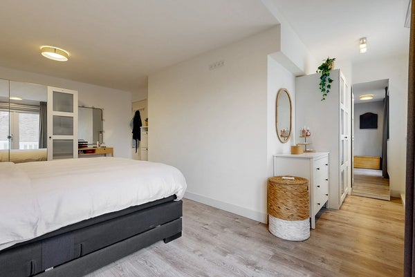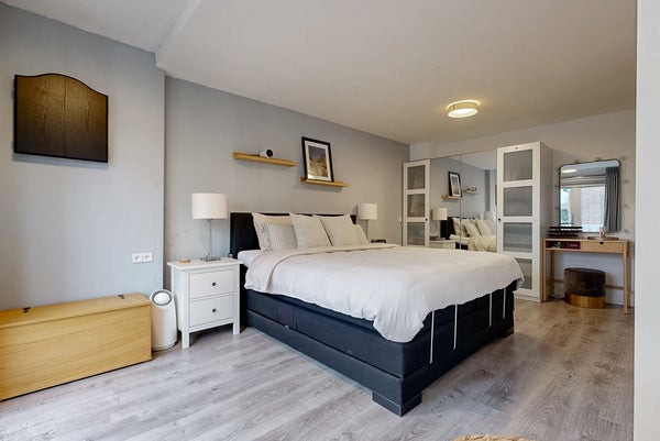 • Eerste verdieping: Overloop met twee slaapkamers, waaronder een royale ouderslaapkamer over de volle breedte van het huis met openslaande deuren naar het balkon. De voormalige badkamer is omgetoverd tot praktische wasruimte met tweede toilet. De moderne badkamer heeft een ligbad, aparte douche en stijlvol wastafelmeubel.