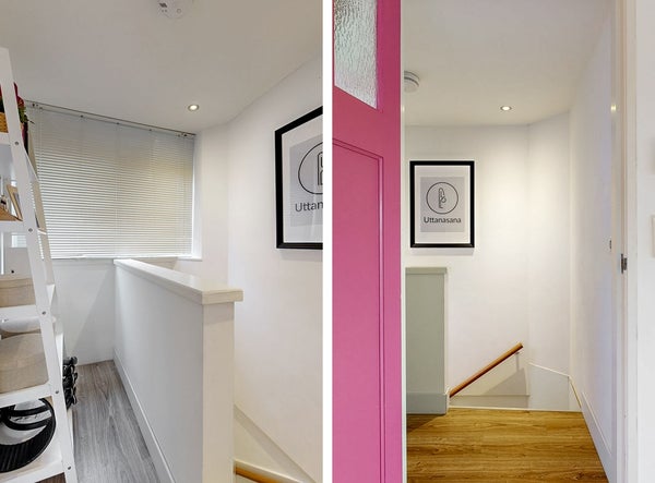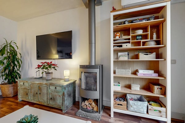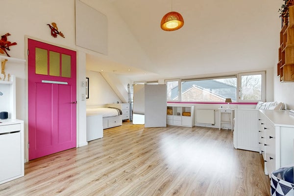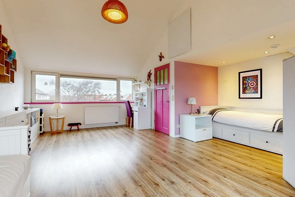 • Ground floor: Through the entrance hall with cloakroom and modern toilet you walk into the sleek white kitchen with cooking island and various built in appliances. The spacious seating area at the garden side is delightfully light thanks to the many windows and has a cosy wood burning stove – ideal for winter evenings. French doors open onto the sunny back garden with a large shed spanning the full width.