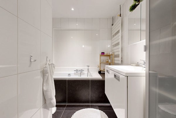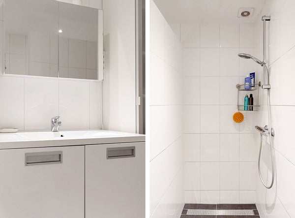 • First floor: Landing with two bedrooms, including a generous master bedroom across the full width of the house with French doors to the balcony. The former bathroom has been converted into a practical laundry room with a second toilet. The modern bathroom features a bathtub, separate shower and stylish washbasin cabinet.
