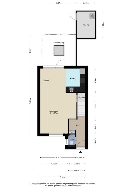 Bij binnenkomst komt u in de hal met toegang tot een moderne meterkast, toilet en trap naar de eerste verdieping. De woonkamer heeft een plavuizenvloer en een open keuken, compleet met inductiekookplaat en vaatwasser, en loopt door naar de tuin met fraaie overkapping en berging.
