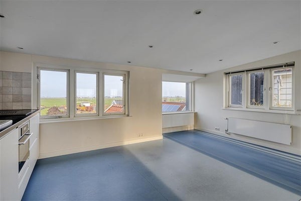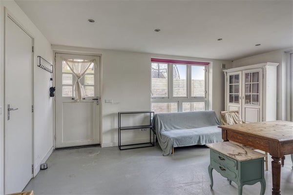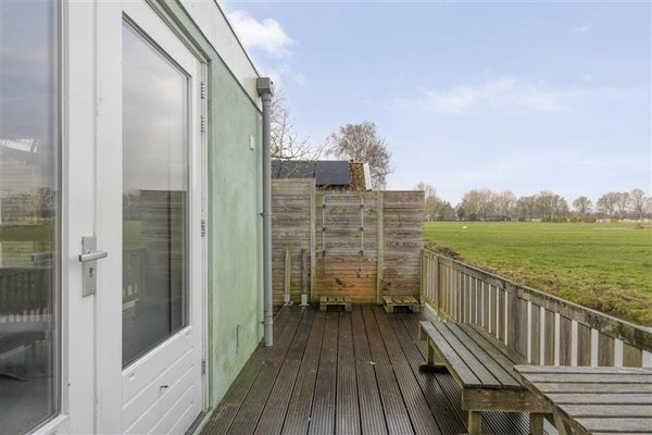 Benedendijks bereikbaar met trap vanuit de woonkamer op dijkniveau, een grote open ruimte met toegang tot de tuin, badkamer, aanbouw met hal, toilet en slaapkamer;