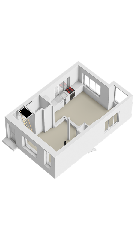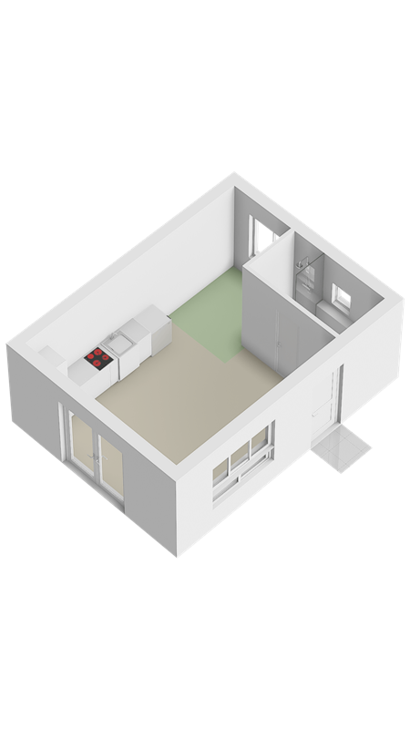 Geheel op de begane grond: Entree, badkamer met douche en toilet, woonkamer met open keuken en niet afgesloten gedeelte waar bed is geplaatst, toegang tot het terras aan de achterzijde met vrij uitzicht over de weilanden.