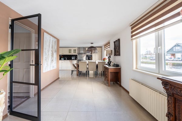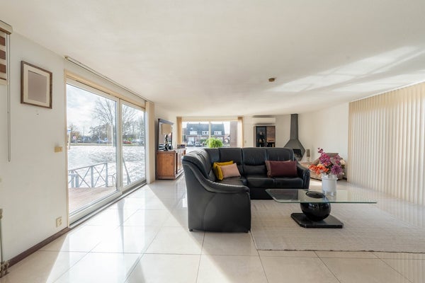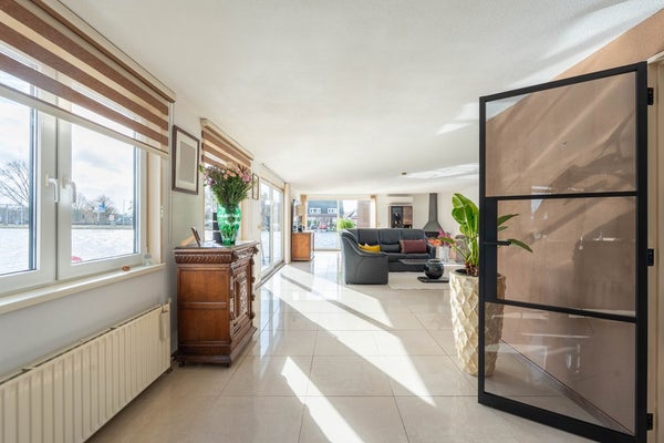 Op de verdieping is een enorme woonkamer met open keuken v.v. BOSCH solitaire fornuis met oven en wasemkap, vaatwasser en koel-vriescombi. De hele verdieping is voorzien van hoogglans plavuizen. De woonkamer beschikt aan de waterzijde en aan de tuinzijde over een schuifpui. Entree in de ruime hal waar ook een gastentoilet en de trap naar beneden is.