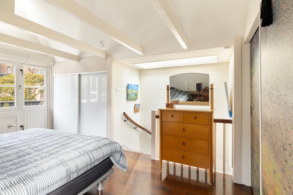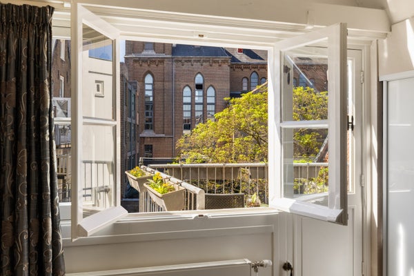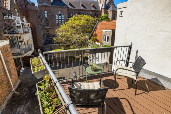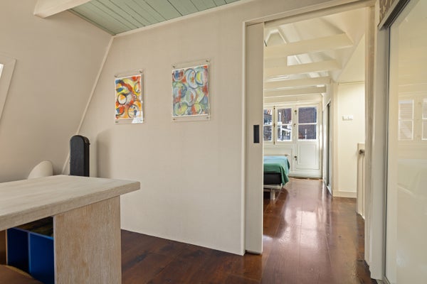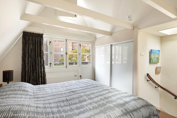 Derde verdieping: de slaapverdieping met aan de achterzijde een slaapkamer met een plafondhoogte van ruim 3,5 meter en de authentieke balken in het zicht. Aan de voorzijde de tweede slaap/werkkamer. Beide kamers zijn voorzien van vaste kasten met schuifdeuren en een doorlopende lage kastenwand (boeken/dressoir). De vliering, via deze slaapkamer te bereiken met een opbergbare ladder, is ideaal voor bergruimte. Het zonnige dakterras ligt op het zuidwesten met vrij uitzicht over de binnentuinen en de Posthoornkerk.