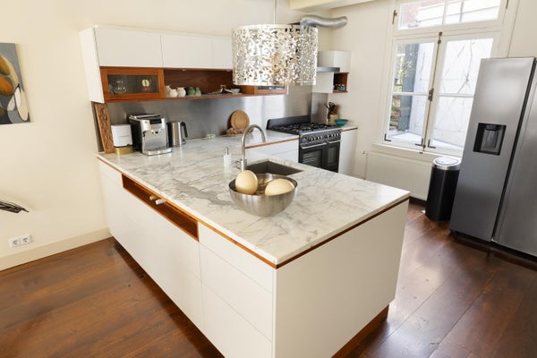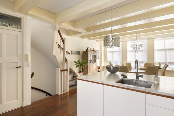 Eerste verdieping: hier bevindt zich de lichte en gezellig woonkeuken, met aan de voorzijde drie ramen breed en sfeervolle balken in het zicht. De op maat gemaakte hoekkeuken is voorzien van diverse inbouwapparaten, waaronder een groot 5-pitsgasfornuis met dubbele oven. Het stijlvolle marmeren aanrechtblad maakt de keuken helemaal af. Verder op deze verdieping een vaste kast, een toilet en een grote bijkeuken met plaats voor wasmachine/droger en cv-opstelling.