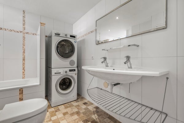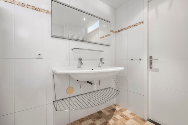 Landing with access to three well-proportioned bedrooms, one of which features a relocation window (HR++ glass with integrated sun shading). The bathroom is comfortable and fully equipped with a double washbasin, a bathtub with shower, and a washing machine connection.