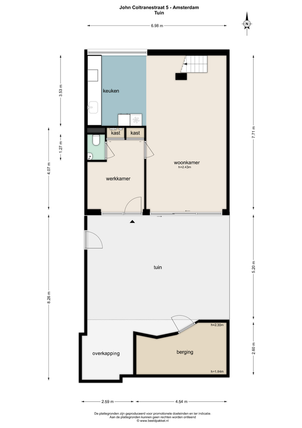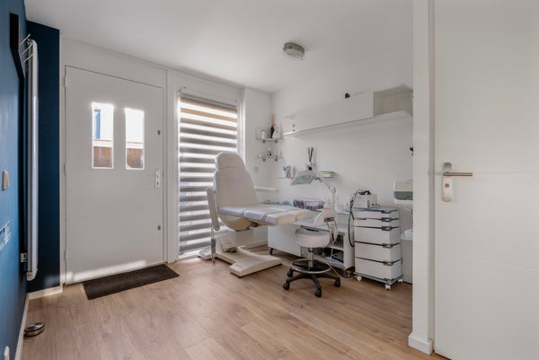 Entree in de werkkamer met separaat toilet. De royale woonkamer strekt zich uit over de volledige lengte van de woning en kijkt uit over de tuin. Aan de achterzijde van de woning bevindt zich de moderne open keuken. Deze is voorzien van diverse inbouwapparatuur, w.o.: inductiekookplaat, vaatwasser, combioven, koelkast, vriezer en afzuigkap en Quooker. Via de woonkamer is er middels een brede schuifpui toegang naar de royale tuin. De tuin is verzorgd, voorzien van siertegels met en beschikt over een houten schuur met overkapping welke begin 2025 verbouwd en betegeld is.