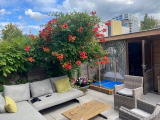 • Royale zonnige tuin op het zuiden met houten/stenen schuur en overkapping