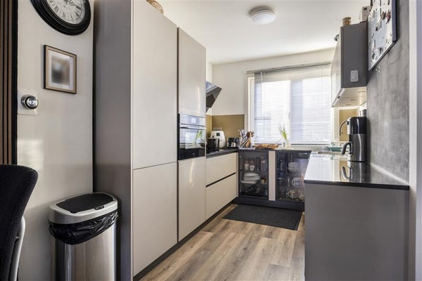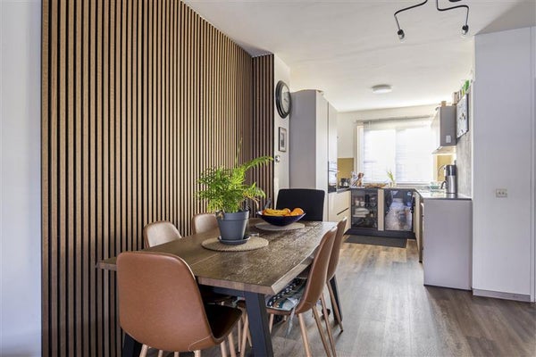 De woonkamer loopt over in de keuken en heeft een strakke, tijdloze uitstraling. De keuken is voorzien van diverse inbouwapparatuur en biedt veel werk- en kastruimte. Ideaal voor wie graag kookt en ondertussen in contact wil blijven met gezin of gasten. Op de begane grond is bovendien gedeeltelijk vloerverwarming aanwezig, wat bijdraagt aan extra wooncomfort.