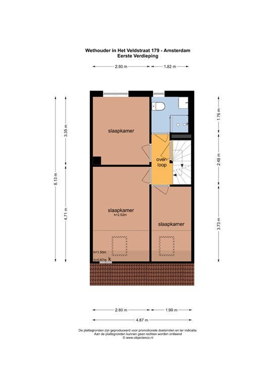 De eerste verdieping beschikt over drie slaapkamers en een badkamer (douche, wastafel en toilet). Alle vertrekken zijn bereikbaar vanaf de overloop. De indeling is efficiënt en functioneel, waardoor deze verdieping uitstekend geschikt is als slaapverdieping voor een gezin.