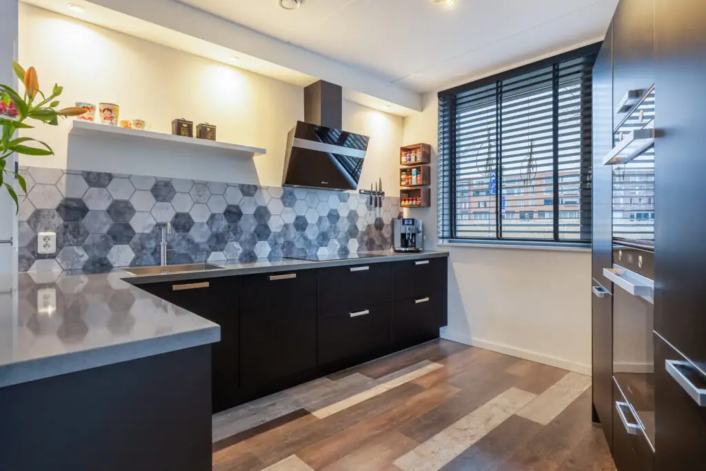 De indeling omvat een hal, modern toilet, luxe woonkeuken, tuingerichte eetkamer met schuifpui, een ruime woonkamer met Frans balkon op de eerste verdieping en een luxe badkamer op de tweede verdieping. De derde verdieping bevat een dakterras van 13 m² en een technische ruimte.