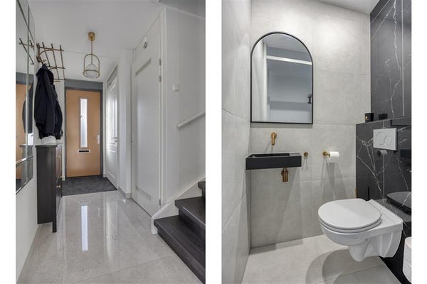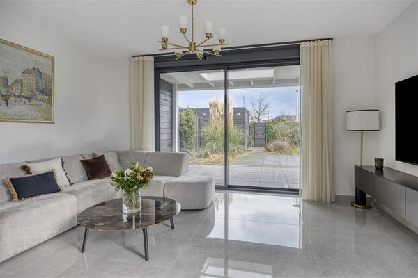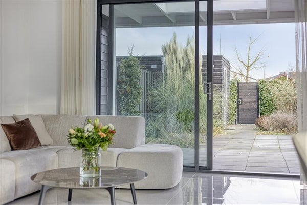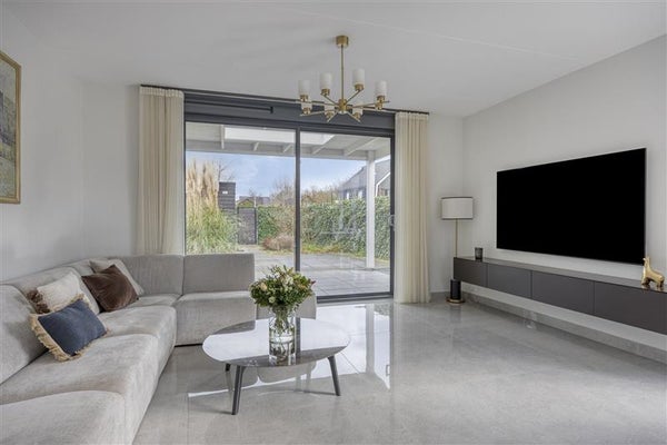 Zodra je de drempel overstapt, voelt dit huis al als thuis. De hal, waar ook een modern toilet is, vormt een uitnodigende entree. Vanuit hier loop je door naar de lichte woonkamer aan de achterzijde. Dankzij de grote schuifpui heb je niet alleen veel lichtinval, maar ook direct toegang tot de fraai aangelegde achtertuin. Met een overkapping die beschutting biedt tegen zowel felle zon als regen, is dit een plek waar je volop kunt genieten van het buitenleven.