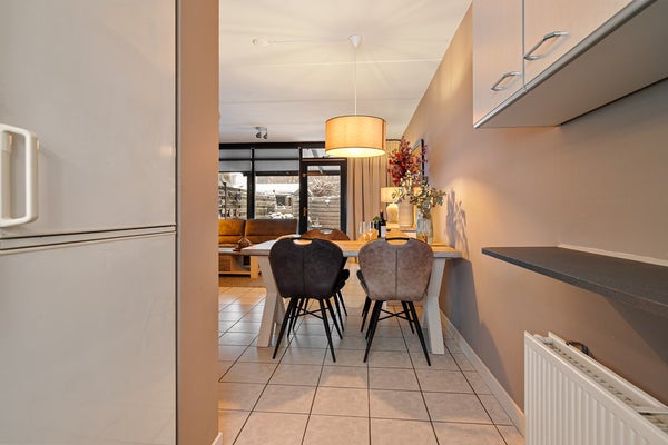 Bij binnenkomst valt meteen de prettige ruimte en lichtinval op. De woonkamer voelt ruim aan en staat in open verbinding met de keuken, waardoor het een fijne plek is om samen te zijn – of dat nu aan de eettafel is of gezellig op de bank. Alles is netjes verzorgd; je merkt dat deze woning met aandacht is bewoond en onderhouden.