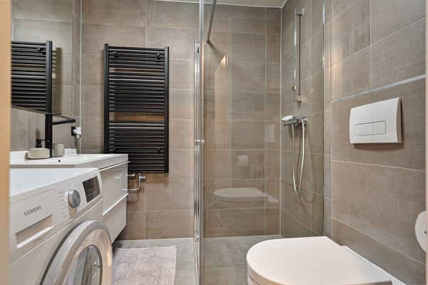 Eerste verdieping: ruime overloop, drie goed bemeten slaapkamers en een luxe badkamer met inloopdouche, wastafelmeubel, designradiator en tweede toilet. Afzuiging via mechanische ventilatie.