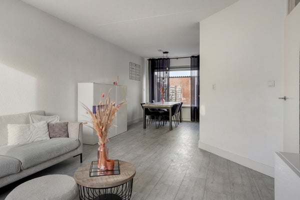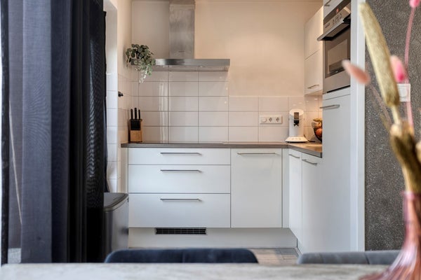 Je betreedt de woning via de ruime hal met meterkast, toilet en trapopgang. Het toilet is netjes uitgevoerd met een hangend toilet en een fonteintje. De lichte woonkamer valt direct op door de prettige lichtinval en de fijne indeling met een gezellige zithoek en eethoek. Daarnaast is er een praktische trapkast aanwezig voor extra bergruimte.