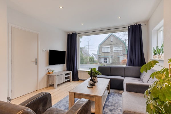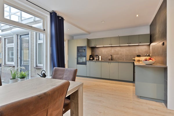 Vanuit de hal bereikt u de lichte en fijne woonkamer, die dankzij de grote raampartijen veel daglicht ontvangt. De woonkamer staat in open verbinding met de keuken, wat zorgt voor een ruimtelijk en gezellig geheel. De woonkamer heeft een oppervlakte van ca. 25,7 m².