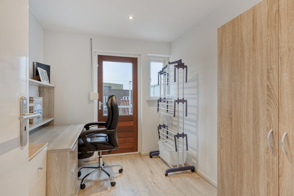 Op de eerste verdieping bevinden zich de overloop, drie comfortabele slaapkamers en een nette badkamer. De badkamer heeft een oppervlakte van ca. 3,7 m² en is uitgevoerd met een douchehoek, badkamermeubel en toilet. Daarnaast beschikt deze verdieping over een ruim dakterras van ca. 10,7 m², een heerlijke plek om buiten te zitten of om wasgoed te drogen.