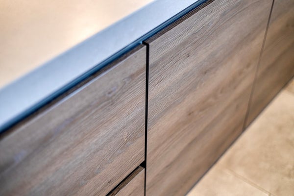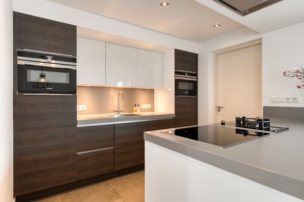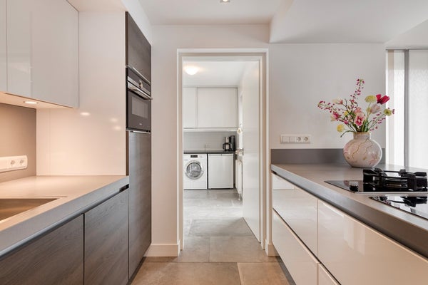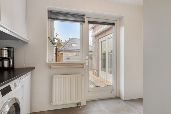 Aansluitend bevindt zich de praktische bijkeuken (circa 5,9 m²) met vaste kastruimte, aansluitingen voor huishoudelijke apparatuur en toegang tot de tuin en garage.