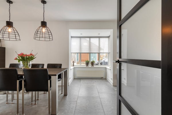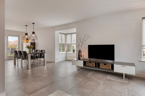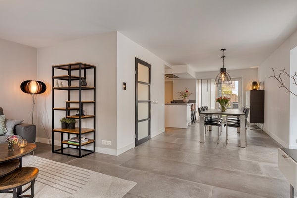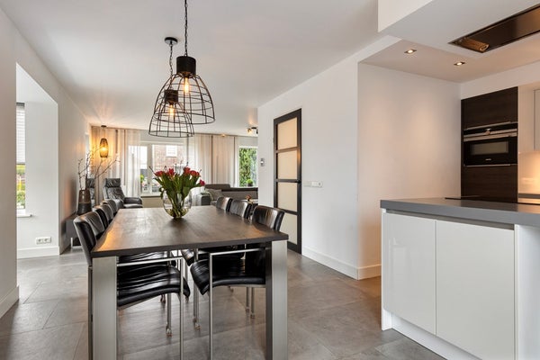 U betreedt de woning via de hal met meterkast, toilet en trapopgang. Vanuit de hal komt u in de royale woonruimte met open woonkeuken. De woonkamer is heerlijk licht dankzij de erker en de grote raampartijen. De zithoek is gesitueerd aan de voorzijde van de woning en biedt een leuk uitzicht op de straat. De eethoek bevindt zich aan de achterzijde, naast de woonkeuken. De schuifpui zorgt voor een fijne verbinding met de tuin. De woonkamer en keuken hebben samen een oppervlakte van circa 50 m², zijn keurig afgewerkt en voorzien van fraaie vloertegels met vloerverwarming. De moderne keuken (2019) is uitgerust met een kookeiland en alle gewenste inbouwapparatuur en vormt het hart van de woning. De apparatuur bestaat onder andere uit een inductiekookplaat, wokbrander, afzuigkap, vaatwasser, koelkast, oven, combimagnetron en Quooker.
