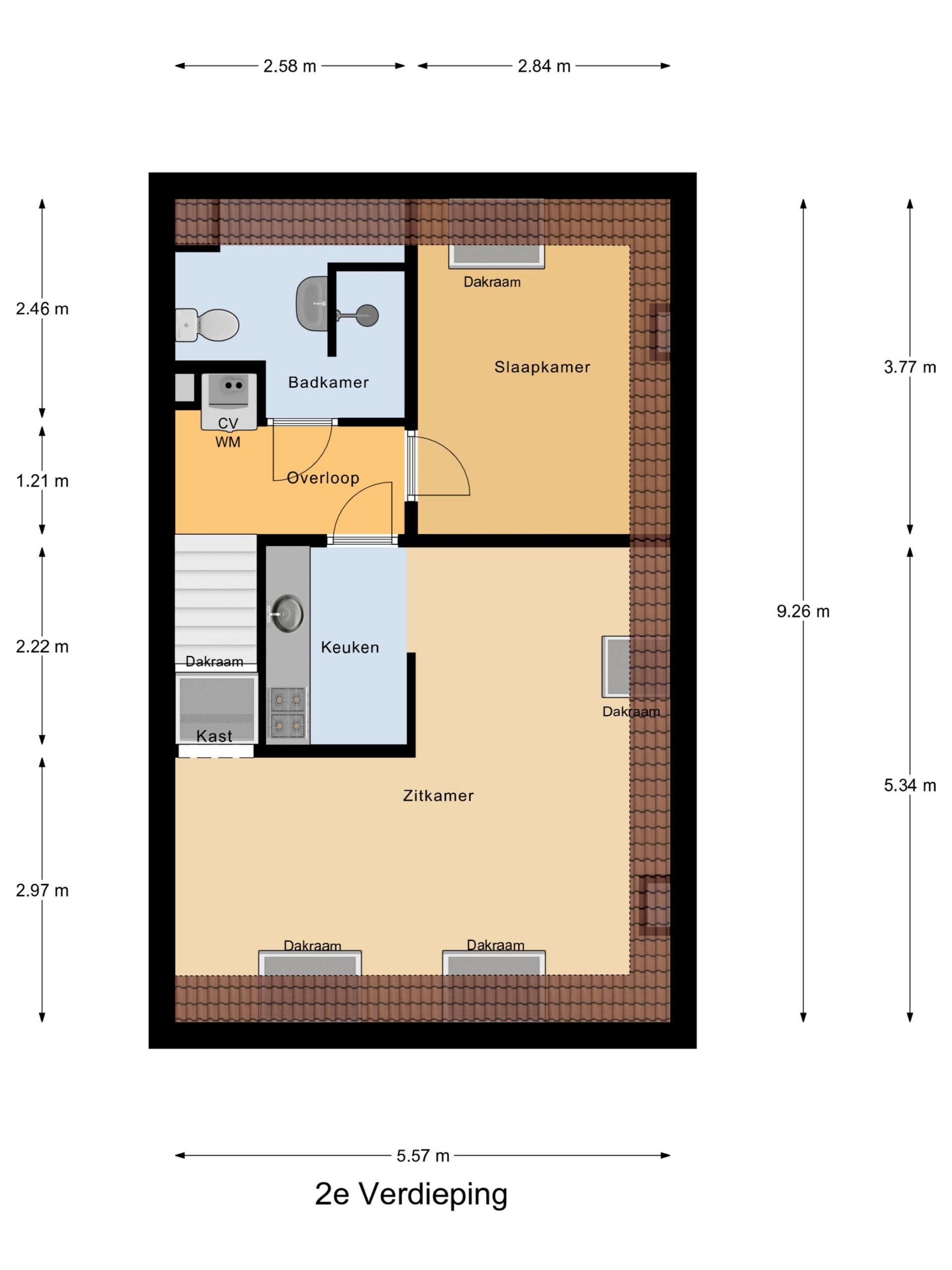 - De tussenwoning heeft een woonoppervlakte van 42 m² en beschikt over 2 kamers, waarvan 1 slaapkamer;