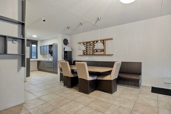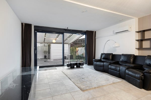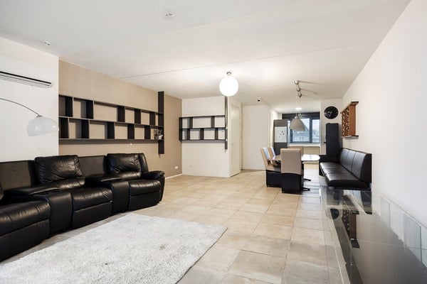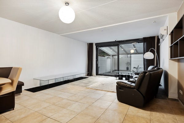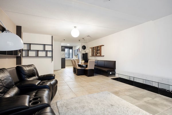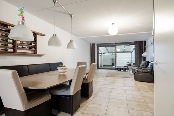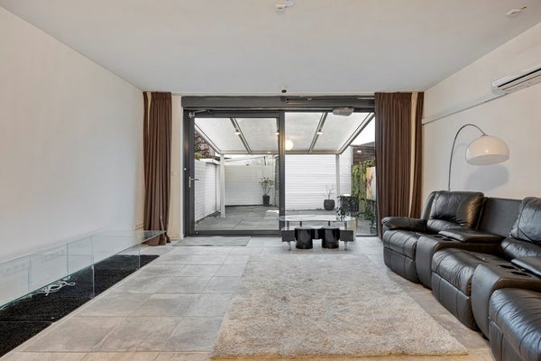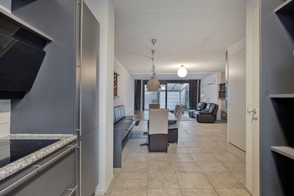 De woon- en eetkamer strekt zich uit over de volledige lengte van de woning en biedt volop ruimte voor zowel een comfortabele zithoek als een ruime eethoek. Aan de achterzijde zorgt een schuifpui voor direct contact met de tuin. Vrijwel de gehele begane grond is voorzien van vloerverwarming en er is airconditioning aanwezig die kan koelen, verwarmen en ontvochtigen.
