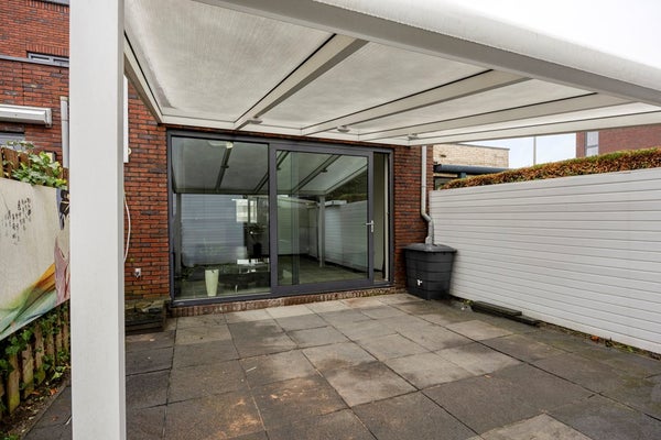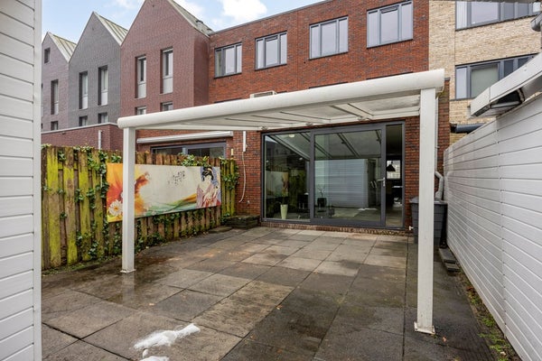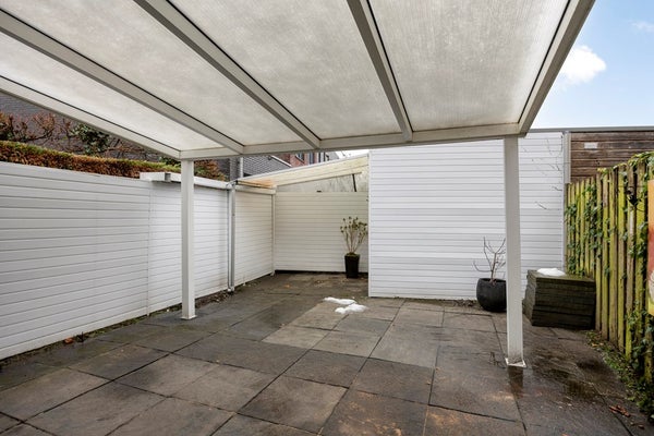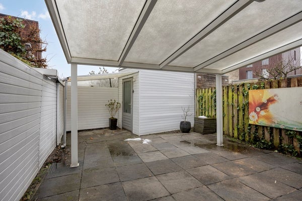 De achtertuin is gelegen op het oosten en beschikt over een overkapping, waardoor er ook bij minder weer prettig buiten gezeten kan worden. Daarnaast is er een externe berging aanwezig, geschikt voor fietsen en extra opslag.