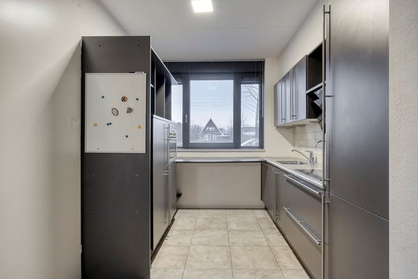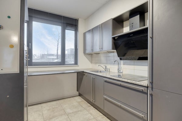 Via de entree betreed je de woning. In de hal bevinden zich het toilet, de meterkast en de trapopgang naar de verdiepingen. Aan de voorzijde van de woning ligt de keuken, uitgevoerd met diverse inbouwapparatuur, waaronder een inductiekookplaat, oven en magnetron, een koelkast met vriezer en een afzuigkap.