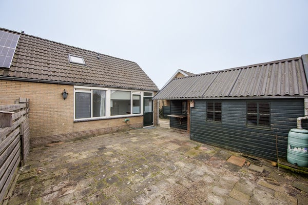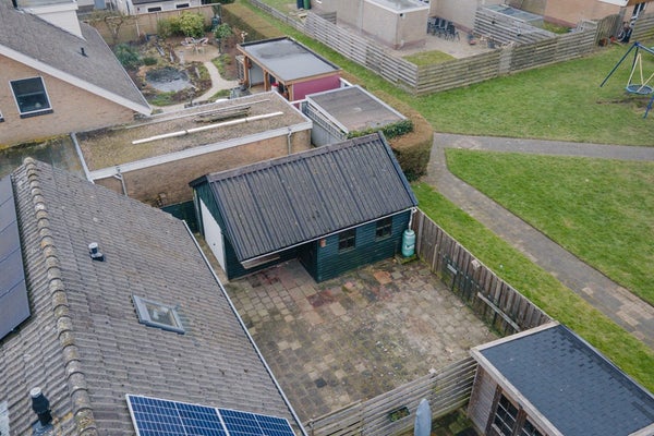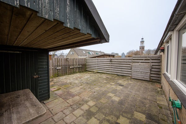 De 8 meter diepe achtertuin ligt op het noorden, maar door de diepte heb je achterin de hele dag de zon. De vrijstaande houten garage heeft een oprit van 15 meter, waar je dus met gemak twee auto’s kwijt kunt.