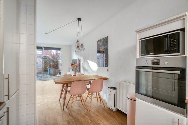 De lichte en ruime woonkamer staat in open verbinding met de eetkamer en keuken. Aan de achterzijde zorgt de aluminium schuifpui voor veel daglicht en een prettige verbinding met de tuin.