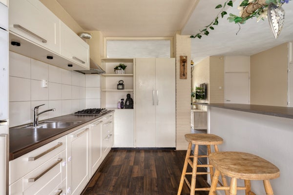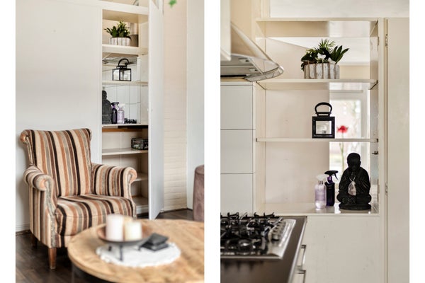 In de wand die zich tussen de woonkamer en de keuken bevindt, zijn 2 bergkasten aanwezig en er is een nisje met legplanken. Dit nisje heeft een deur aan de woonkamerzijde. Als u de deur opent, heeft u een leuk doorkijkje.